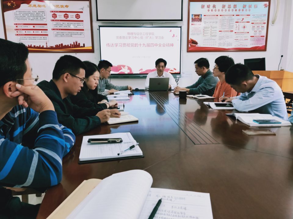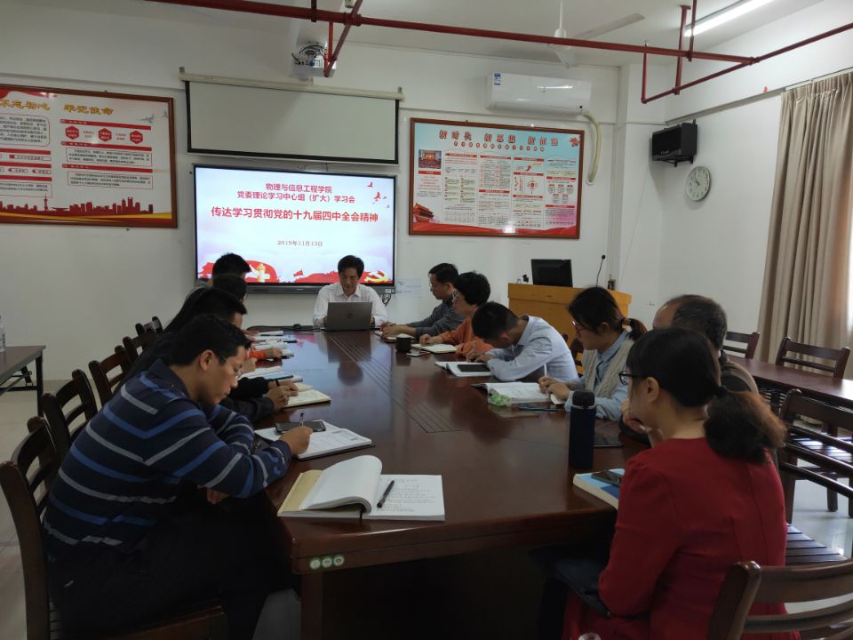 11月13日,物信学院党委理论学习中心组召开专题会议,结合开展“不忘初心、牢记使命”主题教育传达学习贯彻党的十九届四中全会精神。学院党政领导、党委委员和全体党支部书记出席会议,会议由学院党委主持工作副书记杨红和主持并做传达学习。