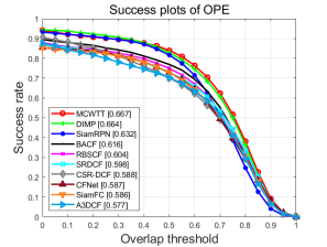 表1 LaSOT、OTB100和UAV123数据集的详细对比.最好的三个结果以红色、蓝色和绿色字体显示.