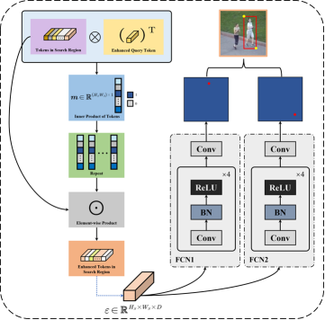预测分析模块如图4所示,包含了边界框预测头以及分类分数头,特征融合模块最终输出的增强特征 将分别送入边界框预测头以及分类分数头进行分析,从而实现进一步的跟踪以及预测。