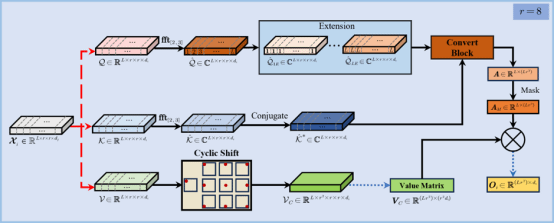 3. 新颖的注意力计算策略:该策略先将空域中的注意力计算视为矩阵间的相关运算,再利用快速傅里叶变换(FFT)的优势将空域相关运算转换为频域中的点乘运算,显著提高计算效率并降低存储成本;