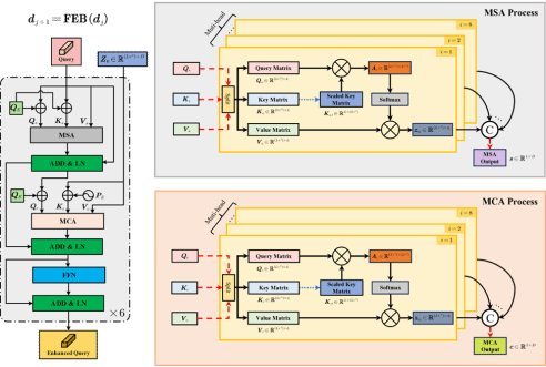 如图3所示,借助特征增强模块中的多头自注意力(MSA)与多头交叉注意力(MCA)单元,特征增强模块对目标序列Query进行学习,特征增强模块与特征融合模块一起构成Transformer所具有的编码-解码器构造,帮助了模型构建起时间上下文感知,进而获得更为丰富的时-空上下文关联信息,最终对模型进一步提升精度施加影响。