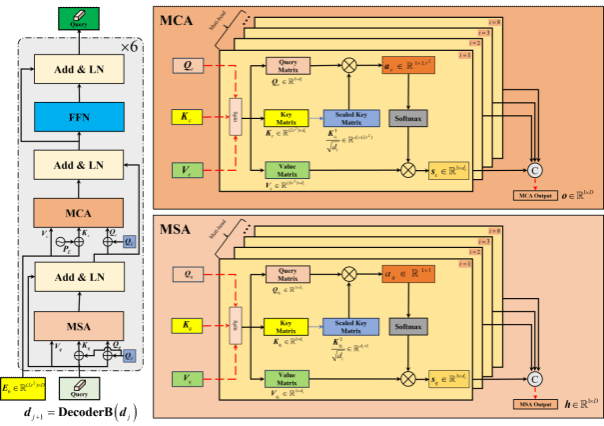 图3 SE模块图. (a)标准的自注意力计算; (b) 带选择性消除模块的自注意力计算; (c) 标准的softmax计算; (d) 带选择性消除模块的softmax计算. 图4展示了编码器的主要结构。通过该模块的多头自注意力(MSA)块与多头交叉注意力(MCA)块完成对查询(Query)嵌入的学习,进而再通过图5的角点检查头确定目标的状态。最后,将学习到的查询嵌入馈送到分数头,如图1所示,一旦分数头的输出超过阈值,则更新动态模板,否则不更新。