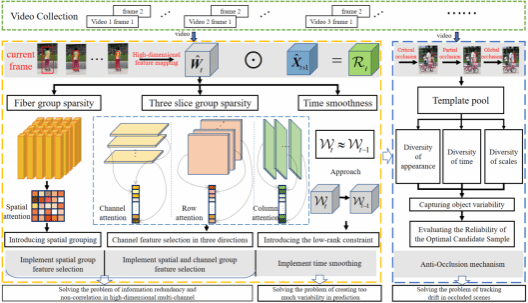 基于判别式相关滤波的跟踪框架因其高效的运算和良好的跟踪性能成为目标跟踪领域的主流跟踪框架,特别适合于算力有限的边缘计算平台,如无人机、无人车驾驶等。尽管现有的无人机跟踪框架取得了显著进展,但仍面临诸多挑战亟待攻克。传统相关滤波跟踪方法将提升算法性能聚焦在特征表达、空间正则化技术和时间平滑性三个方面。然而,这些方法在处理多通道特征时,往往包含大量冗余和无关信息,忽视了不同通道特征的稀疏性,导致无人机跟踪系统难以有效区分类内干扰物与真实目标。由于忽略滤波器中冗余、干扰信息的去除以及遮挡场景下的滤波器保护,以至于在背景散乱、遮挡等复杂场景中表现不佳。