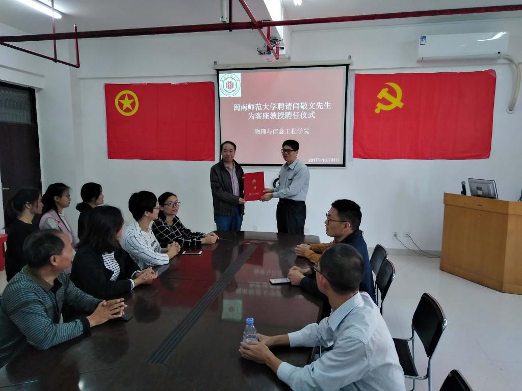 物信学院于2017年10月31日下午在科技楼北907举行客座教授聘任仪式。聘任仪式由院党委书记张跃聪主持,副院长白炳良、院长助理陈添丁及师生代表参加了聘任仪式。物信学院聘任厦门大学博导闫敬文教授为客座教授,闫教授就研究生联合培养,学科建设等众多领域与学院领导、专任教师以及研究生展开热烈讨论。闫教授表示,将大力支持日本无码