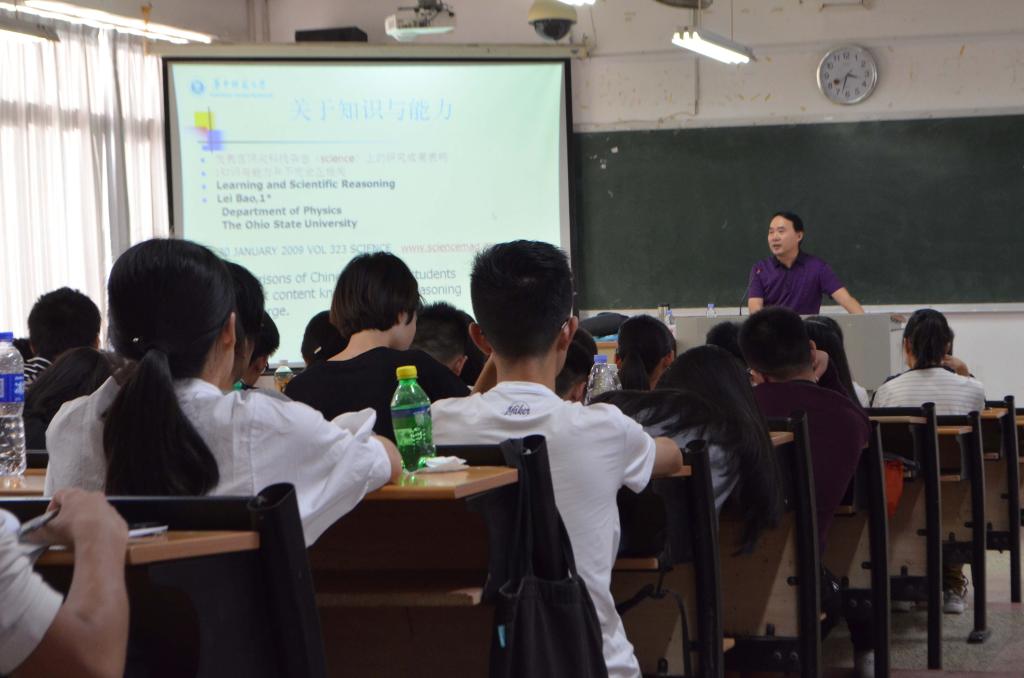 11月2日下午,华中师范大学黄致新教授应邀来物信学院讲学,在博西405室做了以“中外物理教育及其研究比较概述”的学术讲座。此次讲座由物信学院党委书记张跃聪主持,一百余名师生参加了本次讲座。