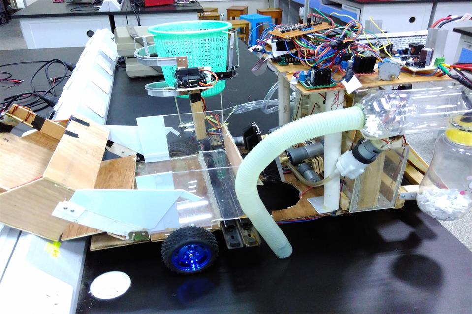 学生连严明、杨帆、刘嘉杰、候长江共同完成的《多功能机器人清洁小车》巧妙利用好单片机原理加上软件编程,制作成具有清洁功能的机器人。其中机器人使用两大轮子,实现前后,左右移动灵活转动,并且可以巧妙自如地实现扫地机的下降打扫与升起;控制舵机可以实现车载机械臂对垃圾桶的抓捡与倒垃圾、地面垃圾物体的打扫与入桶、与摄像装置对路面的时事观测。机器人以灵活的清洁功能,受到评委的一致好评,斩获了本次大赛的一等奖。其中作品《会写字的白板钟》、《多功能的饮水机》、《黑板爱消除》以创新设计,惠于生活,便于生活的理念荣获三等奖。