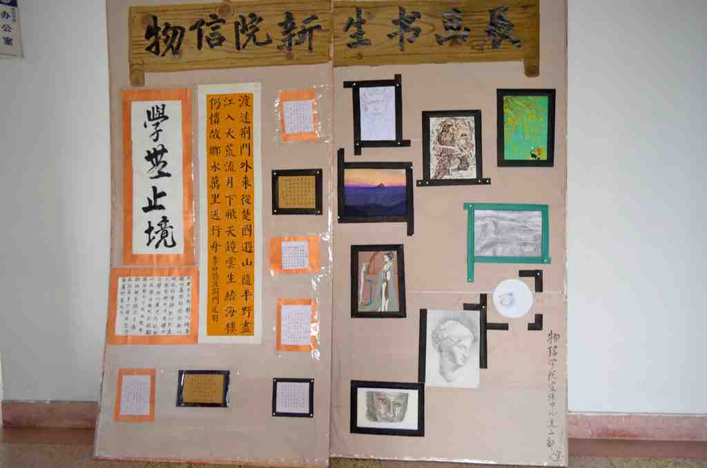 物信学院为培养学生的综合素质,在开学之初就举办了新生书画赛。14级新生积极投稿,稿件数量成效乐观。经过几轮激烈的比拼,优秀的作品闪亮登场于达中物信学院系办处,一进达中信学院系办,便可见到“物信学院新生书画展”这一牌匾,让人印象深刻。