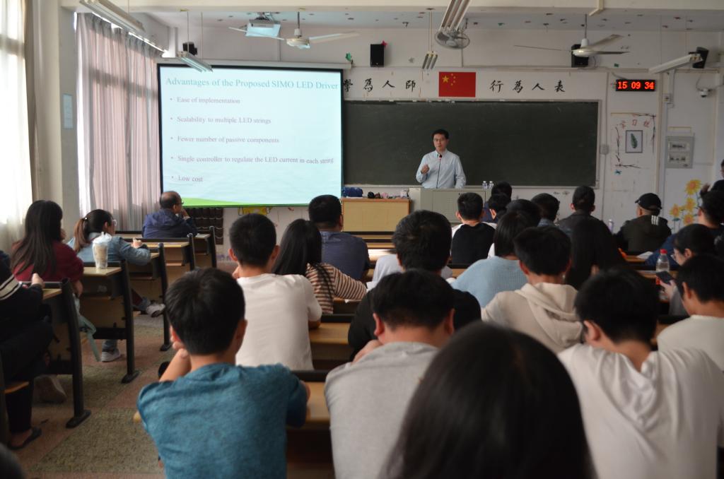 首先,李博士用PPT形式分析物理电路图,展示了多个物理公式,让在场的听众大致了解了电子通信。接着,他分别从项目一“DC-DC Single-Inducter Multiple-Output(SIMO)LED Driver”和项目二“AD-DC Single-Inducter Multiple-Output(SIMO)LED Driver”进行彻底的阐述,详细的提出基于simo的LED驱动器的优点,引起师生极大的重视和兴趣。在讲座上,李博士对电子通信方面的问题,进行了详细的分析与解答,加深了大家对电感输出的认知。最后,他以发展的眼光,向大家分析了电信未来的趋势,强调电子信息专业当下发展趋势于全球化、技术化、产业规模与消费个性化的现状。