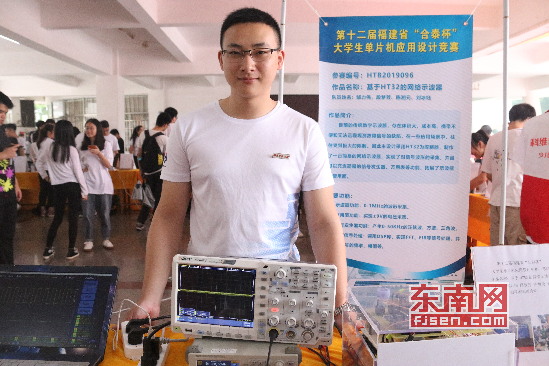 电子设计作品展区共展出设计作品47件,均是学生参加各类电子设计大赛的获奖作品。其中第十二届福建省“合泰杯”单片机应用设计竞赛一等奖作品“基于HT32的网络示波器”吸引了众多师生,该作品克服了传统数字示波器体积大、成本高和无法远程观测故障信号等缺陷,同时增加了万用表等功能,拓展了示波器的使用面。2019年校电子设计大赛决赛作品也让大家眼前一亮。基于树莓派Python环境和STM32开发板的人脸识别系统门禁,通过摄像头采集图像和网络算法,实现门禁人脸识别;“超市智能寄存管理系统”采用指纹识别技术完成开箱动作,提高便捷性与安全性,减少传统纸质小票的使用,更加环保。基于STM32的石头剪子布机械手,让现场观众玩得兴致勃勃……