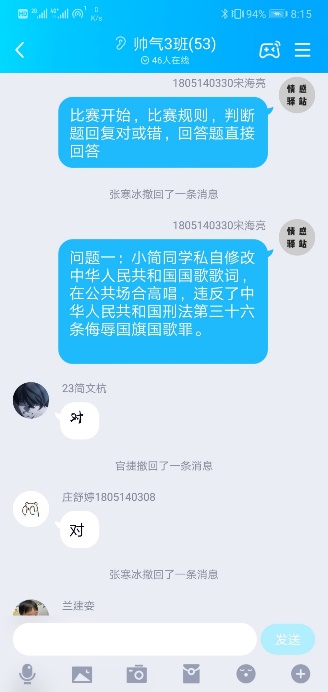 18电子2、18电信3、19物本1团支部采用竞答形式,开展疫情防控、普法、心理健康知识比赛。