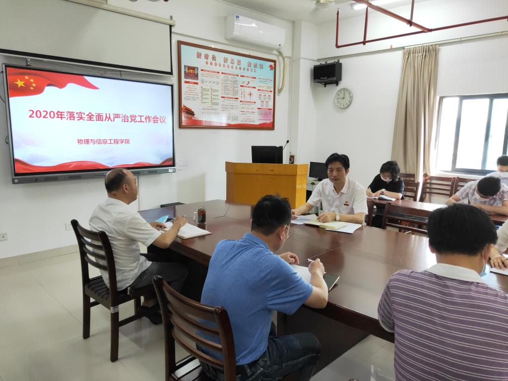 在科技楼北907召开物信学院落实全面从严治党工作会议,学院党政领导、党委委员、科级干部、党支部书记和辅导员参加会议。