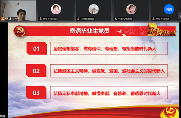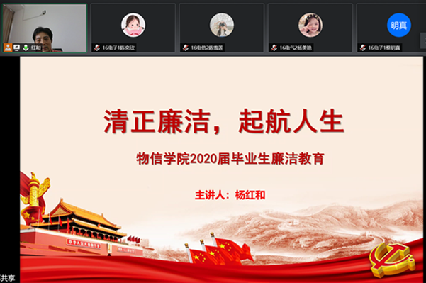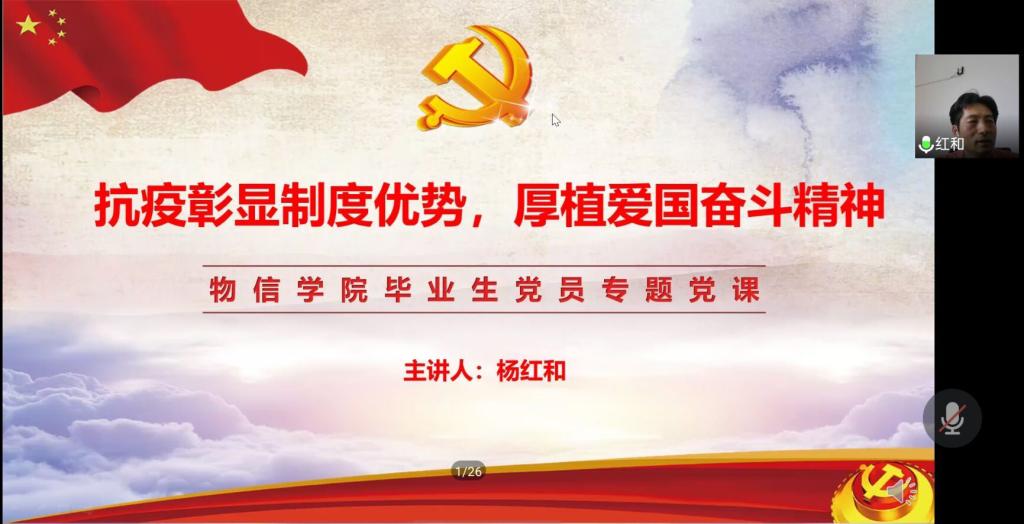 为做好2020届毕业生党员离校教育管理,根据《中国共产党党员教育管理工作条例》和上级有关工作要求,5月28日,物信学院党委书记杨红和同志通过“腾讯会议”在线为全体毕业生党员讲授《抗疫彰显制度优势、厚植爱国奋斗精神》专题党课。