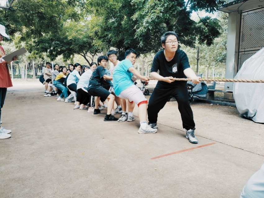 参赛的同学们个个斗志昂扬,为了集体的荣誉拼尽全力,当比赛的哨声一响起,队员们口中一起高呼着“一二,一二”,双手紧握长绳,憋足了劲拼命往后拉