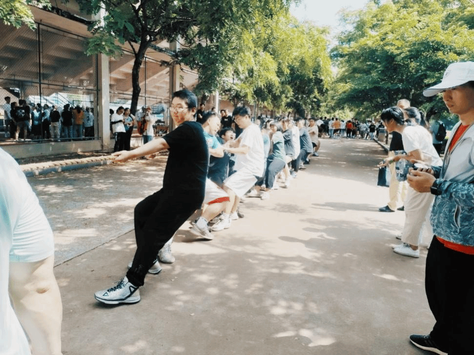 绳子在两队之间来回移动,你来我往之间,观众也激动不已,加油声此起彼伏,随着一次次惊险逆转,现场频爆尖叫声拔河比赛现场,气氛热烈而高涨,跃动的倩影形成了一道美丽的风景线,衬出了靓亮的青春,也展示出物信学子齐心协力、奋勇拼搏、乐观向上、积极进取的精神风貌。