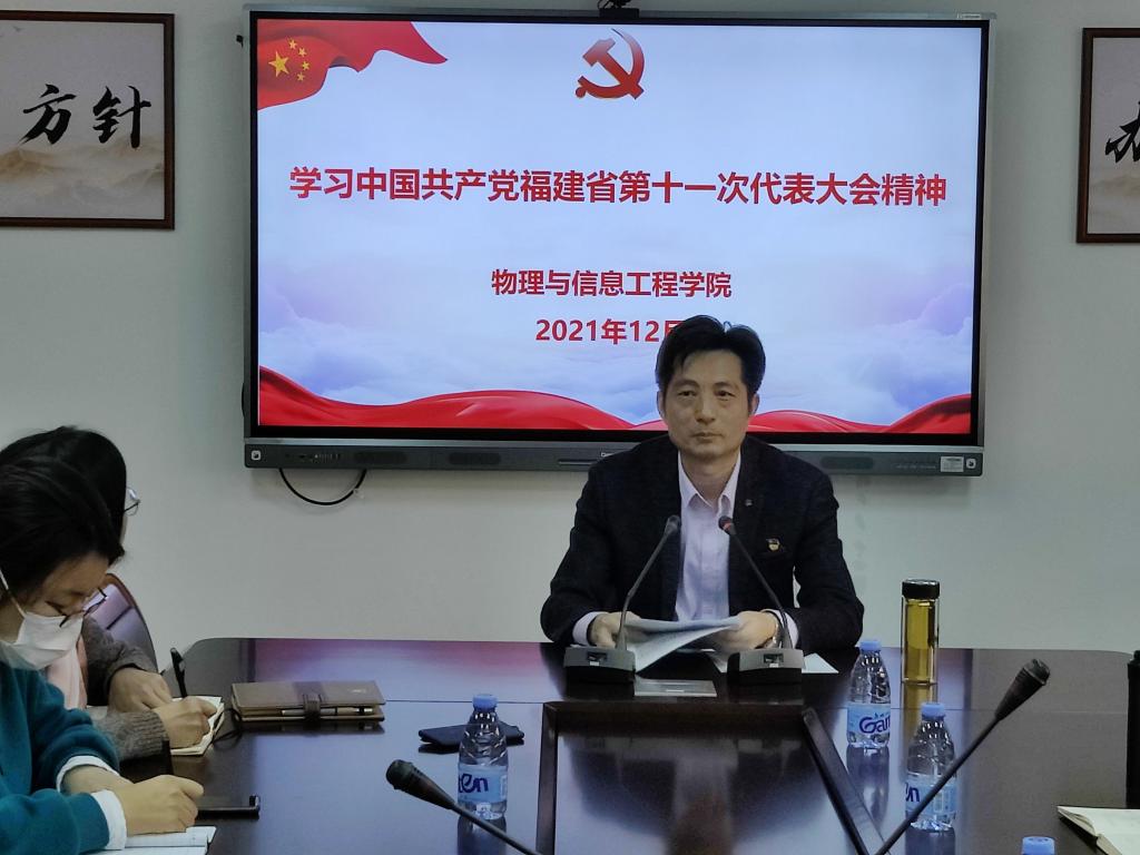 杨红和结合学院实际,就学习宣传贯彻落实省第十一次党代会精神工作提出几点要求:一是要深入学习宣传贯彻,切实把思想和行动统一到省第十一次党代会精神和省委决策部署上来。要发动党员领导干部、各支部书记等深入一线开展精神宣讲,宣讲形式要多样、覆盖面要广,要综合运用线上线下等形式掀起学习热潮,广泛凝聚共识。二是要注重融会贯通,推动学习走深走实走心。要把学习贯彻党的十九届六中全会精神和省第十一次党代会精神作为今后一段时期的重要政治任务,把学习宣传贯彻党的十九届六中全会精神、省第十一次党代会精神同学习贯彻习近平总书记“七一”重要讲话精神和来闽考察重要讲话精神紧密结合,与党史学习教育和开展“再学习、再调研、再落实”活动紧密结合,学深悟透。三是要紧密联系实际,将学习成果转化成推动学院事业进步的强大动力。要把深刻领会落实省第十一次党代会精神,与学院中长期发展规划确定的目标任务相结合,以学科建设引领高质量发展,大力夯实产学研社会服务的基础和平台。要充分发挥基层党组织战斗堡垒作用,充分调动党员积极性,以获批光学工程一级学科硕士点和物理学师范专业认证为契机,强化党建引领学院教学研究与服务地点经济,提升人才培养质量,不断提高广大师生的幸福感和获得感,为谱写福建新篇章贡献智慧和力量。