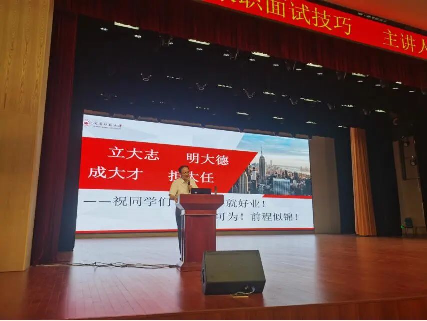 林贵东首先从当前就业形势和学生就业动机等方面出发,启发同学们对未来就业进行思考。接着以毕业生求职过程为纲,为同学们系统讲述了求职过程中信息获取、岗位挑选、简历制作、面试准备等环节的相关内容。