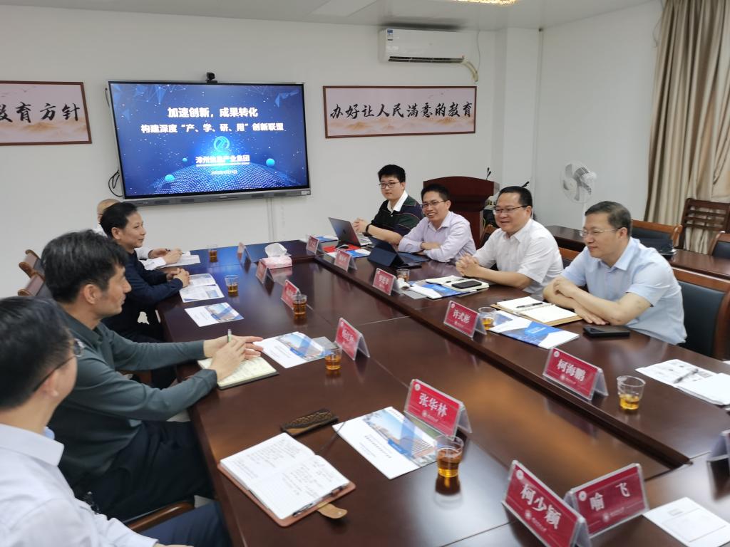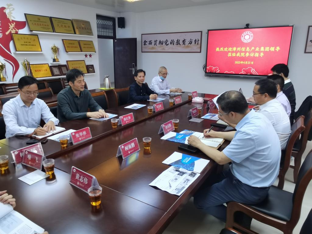 在人才培养、学科建设、办学特色、毕业生实习就业及校企合作等方面的相关情况,希望双方能进一步深化交流与合作,学院将充分发挥学科专业优势和科研水平,转化为服务地方经济社会发展的能力。张华林副院长介绍了学院科研团队的研究方向及承接项目基础。漳州信息产业集团有限公司罗进章总经理介绍了公司的相关情况及目前正在开展合作项目,表示此次到访物信学院,旨在推进公司与物信学院在人才培养、项目落地、成果转化等方面构建深度“产、学、研、用”创新合作。随后,与会双方就校企合作、人才引进、项目开发等具体事项进行深入交流,大家一致认为将共同努力推动校企合作取得丰硕成果。