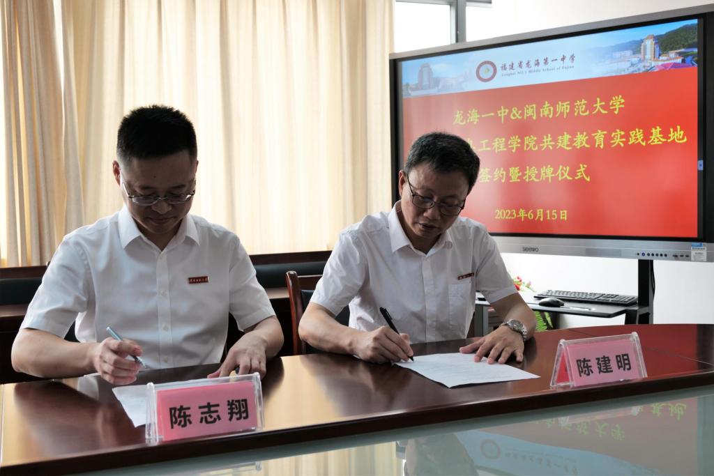陈志翔高度评价了龙海一中的校园文化、育人成果,对陈建明校长的教育理念教育情怀表示钦佩。实践教学基地将为学院师范生成长成才提供沃土,希望双方能够依托基地建设在实践教学、课题研究、人才培养等方面开展全方位深度合作,建立深度的教育科研融通机制,在合作中相互促进,实现共赢。随后,陈志翔院长与陈建明校长代表双方,签订“共建实践教学基地”合作协议。