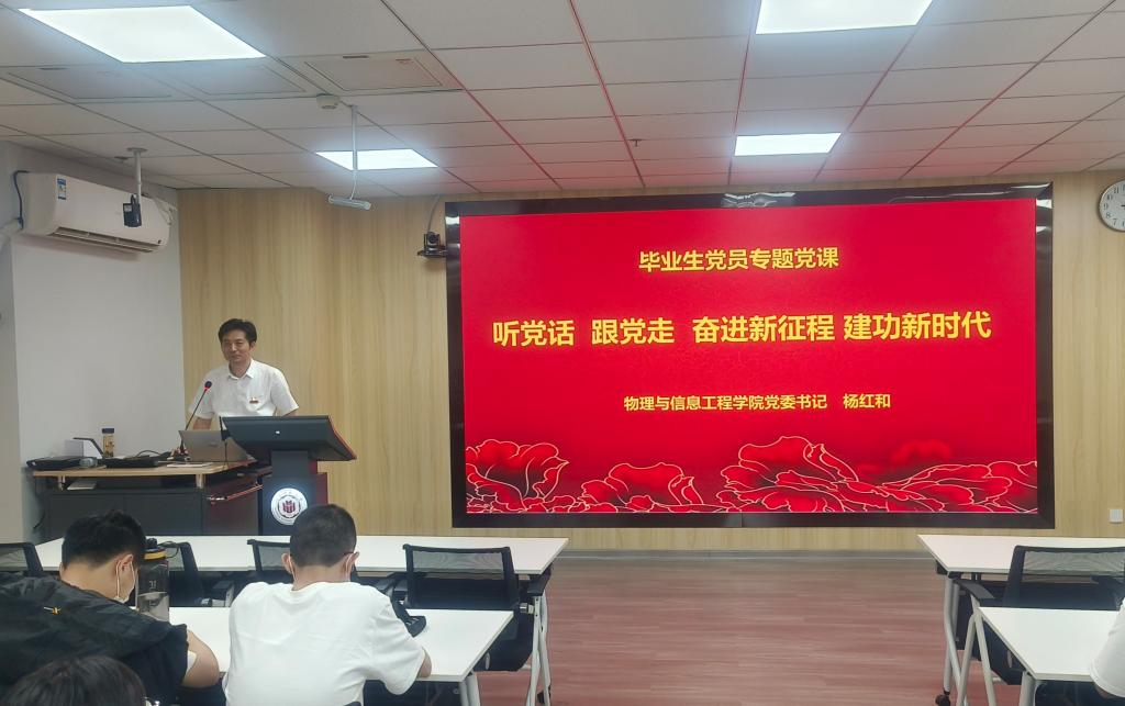 党委书记杨红和在科技楼南809为2023届全体毕业生党员讲授“听党话、跟党走、奋进新征程,建功新时代”专题党课。