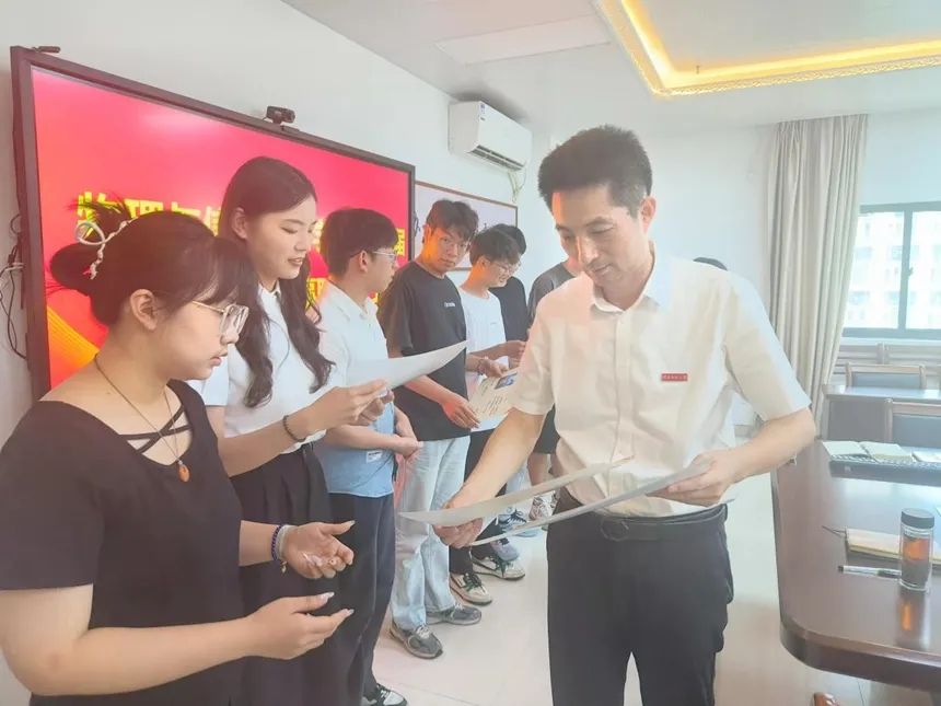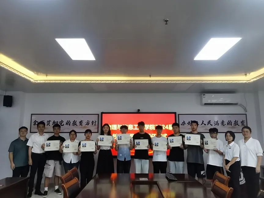 于科技楼北907举行校友理事聘任仪式,学院党委书记杨红和、副书记陈丽新、团委书记杨超男及毕业班辅导员卢圳彬出席仪式。