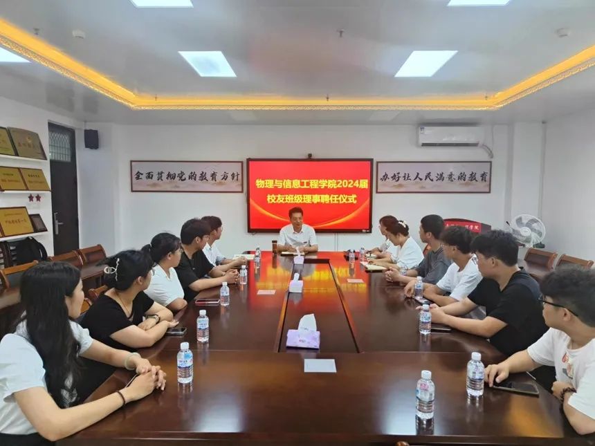 在聘任仪式会上,学院党委书记杨红和对当选学院2024届校友班级理事的同学表示祝贺。他表示,学院的未来发展离不开广大校友的参与和支持,特别是各位同学的积极联络和无私奉献。他希望各位班级理事们认真履行好这份肩负的特殊使命和责任,努力做好学院与校友、校友与校友之间的交流与沟通工作,不负学院的信任与重托,用心、用情、用力做好学院与校友、校友与校友之间联络的桥梁和纽带;心系学院发展,对于学院的人才培养、学科建设积极建言献策,发扬物信文化,宣传学院好成绩,讲好学院好故事,做好物信学院形象的代言人和发展的推动者;发挥先锋模范作用,秉持“博学明理,砺志笃行”的校训,引领广大校友厚植家国情怀,挺膺担当、积极奉献,争做校友和学院共同发展的参与者和奉献者。