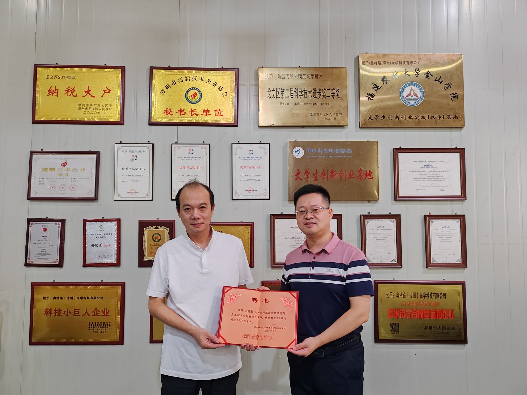 在奥特路(漳州)光学科技有限公司,总经理吴晓彤详细介绍了公司发展、产品特色、产品研发及项目情况。双方就项目合作、光学应用等方面展开深度探讨,为后续合作奠定了良好基础。期间,学院聘请吴晓彤为创新创业导师,进一步加强校企在人才培养等领域的联动,助力提升学生就业竞争力。