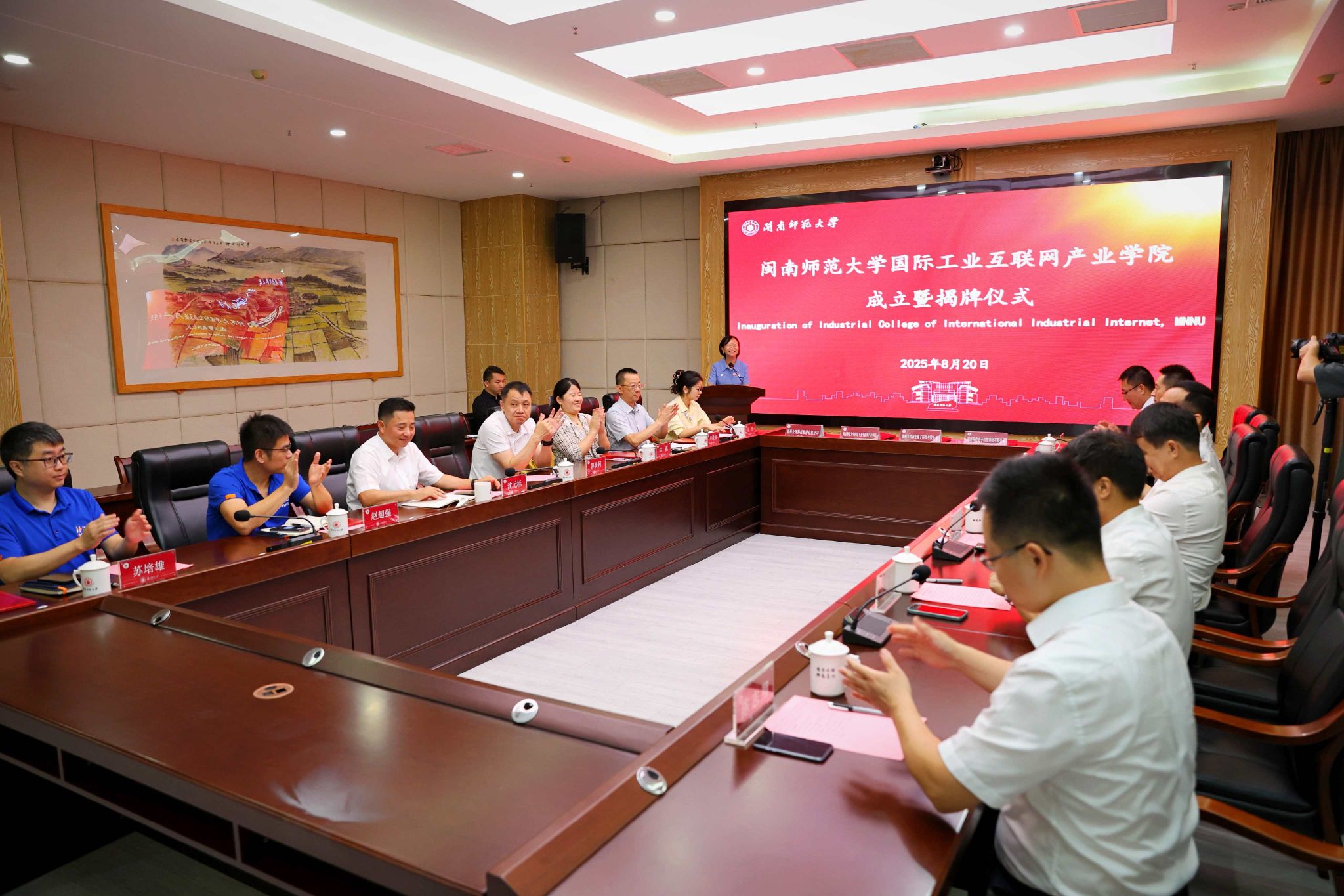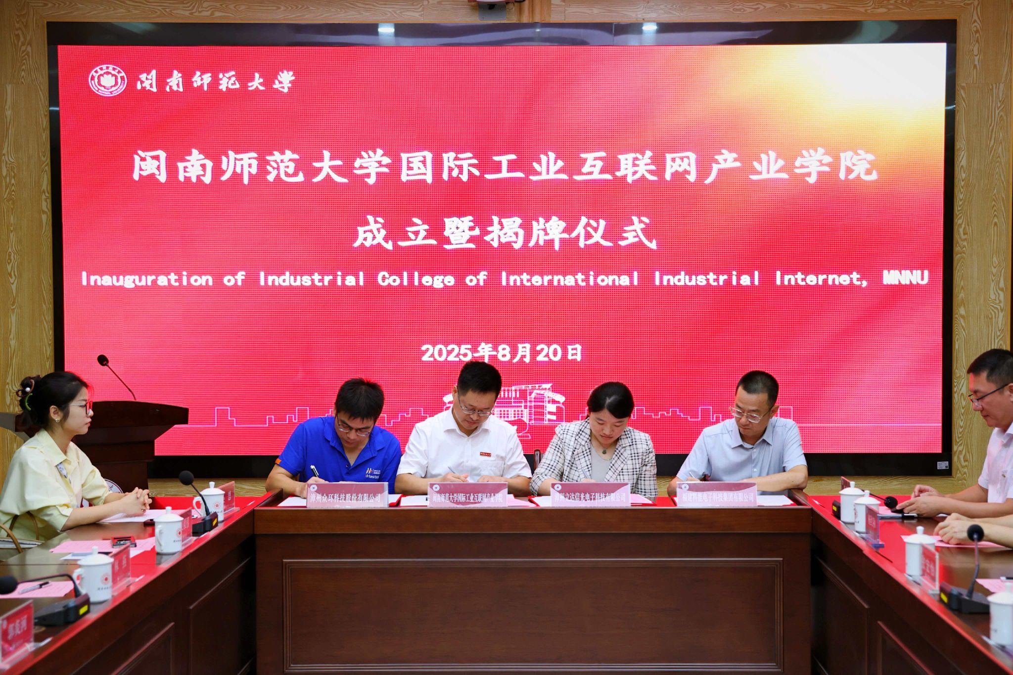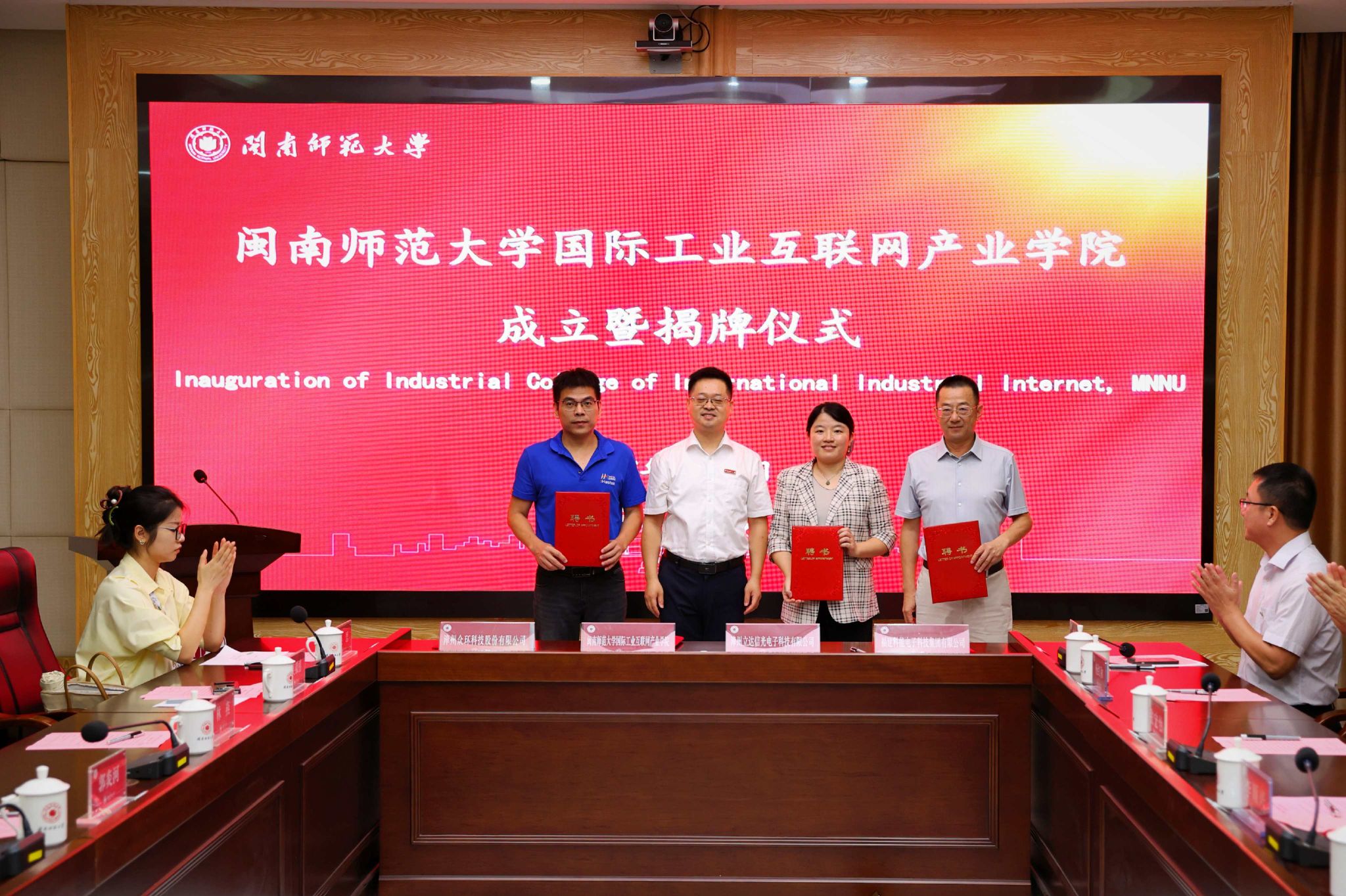 在科技信息楼1607会议室举行国际工业互联网产业学院揭牌仪式。校党委书记李顺兴、校长张龙海出席活动,漳州市工信局、商务局相关领导以及漳州立达信、众环科技、科能电子等合作企业代表现场参会,马来西亚高校、商会相关领导线上参加。校党委常委、副校长张宏怡主持。