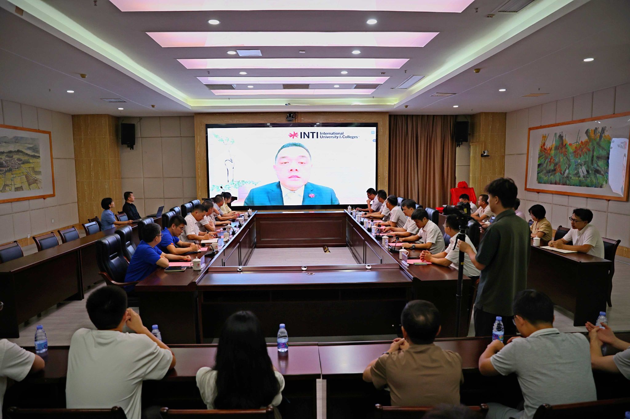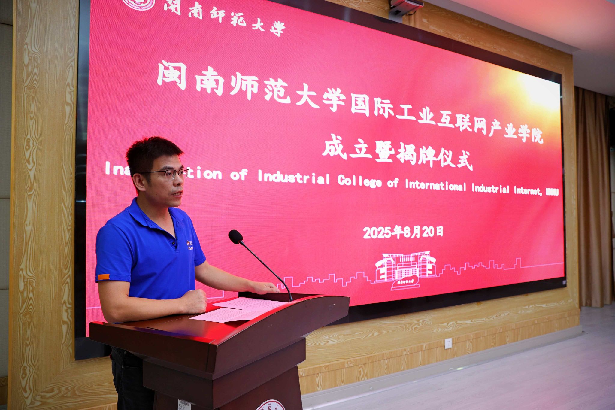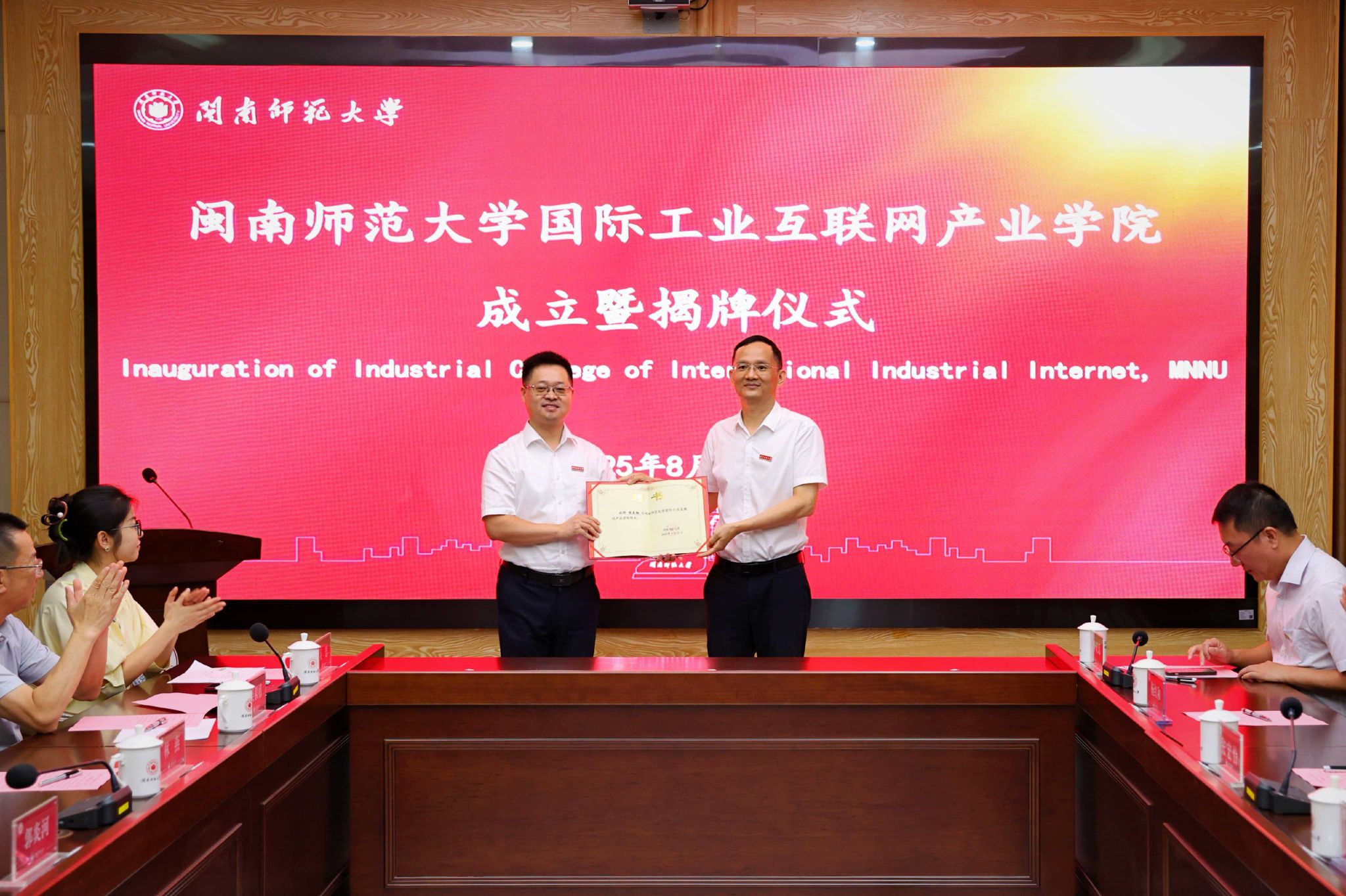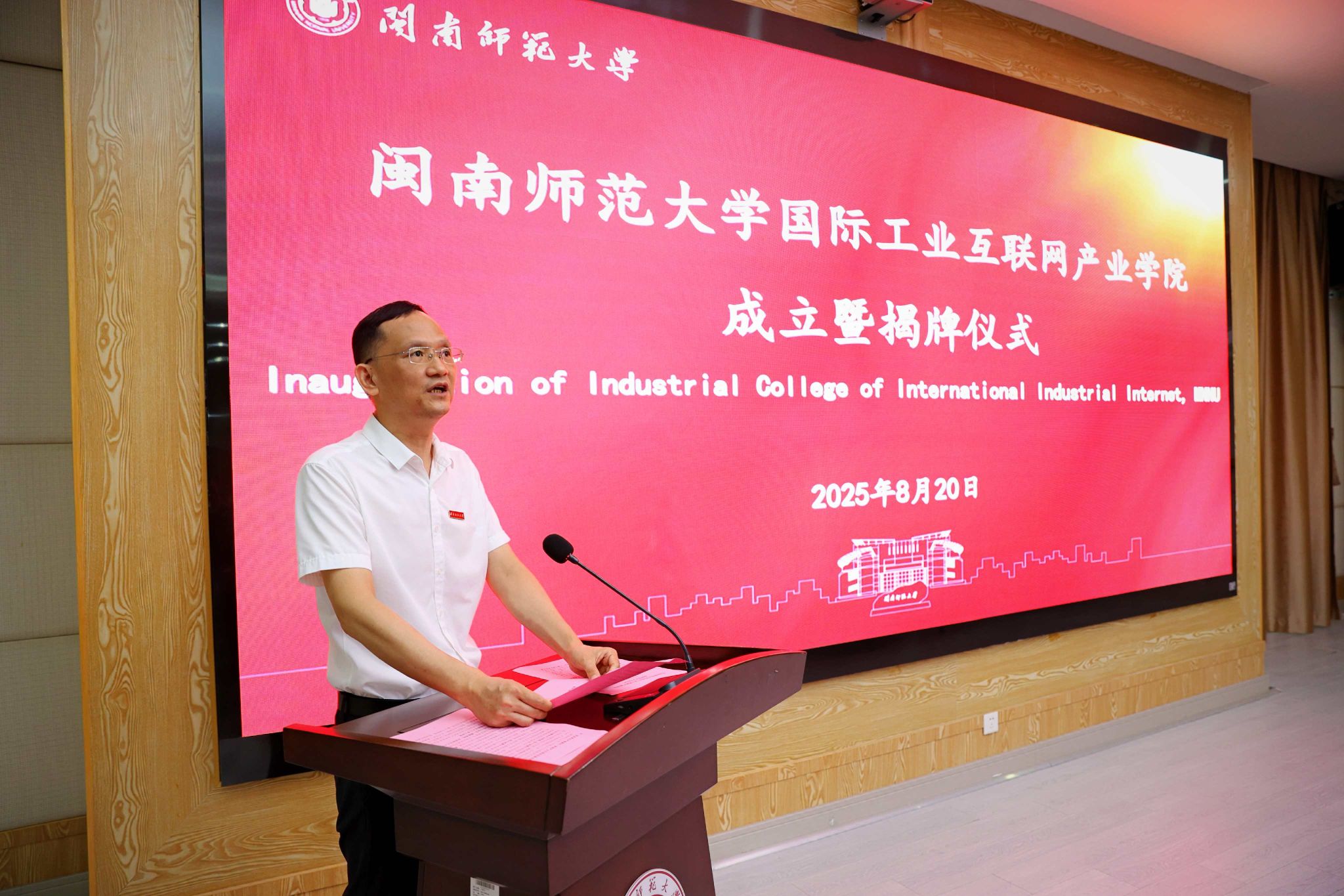 在科技信息楼1607会议室举行国际工业互联网产业学院揭牌仪式。校党委书记李顺兴、校长张龙海出席活动,漳州市工信局、商务局相关领导以及漳州立达信、众环科技、科能电子等合作企业代表现场参会,马来西亚高校、商会相关领导线上参加。校党委常委、副校长张宏怡主持。