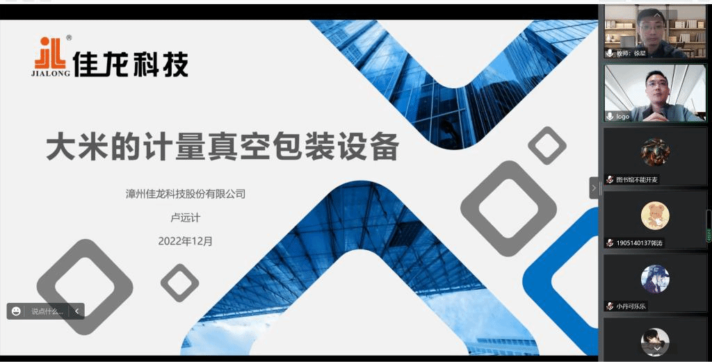 邀请,12月3日上午,漳州佳龙科技股份有限公司工程师卢远计通过腾讯会议作了题为“大米的计量真空包装设备”的报告。相关师生聆听了此次报告,报告由院长助理徐星教授主持。