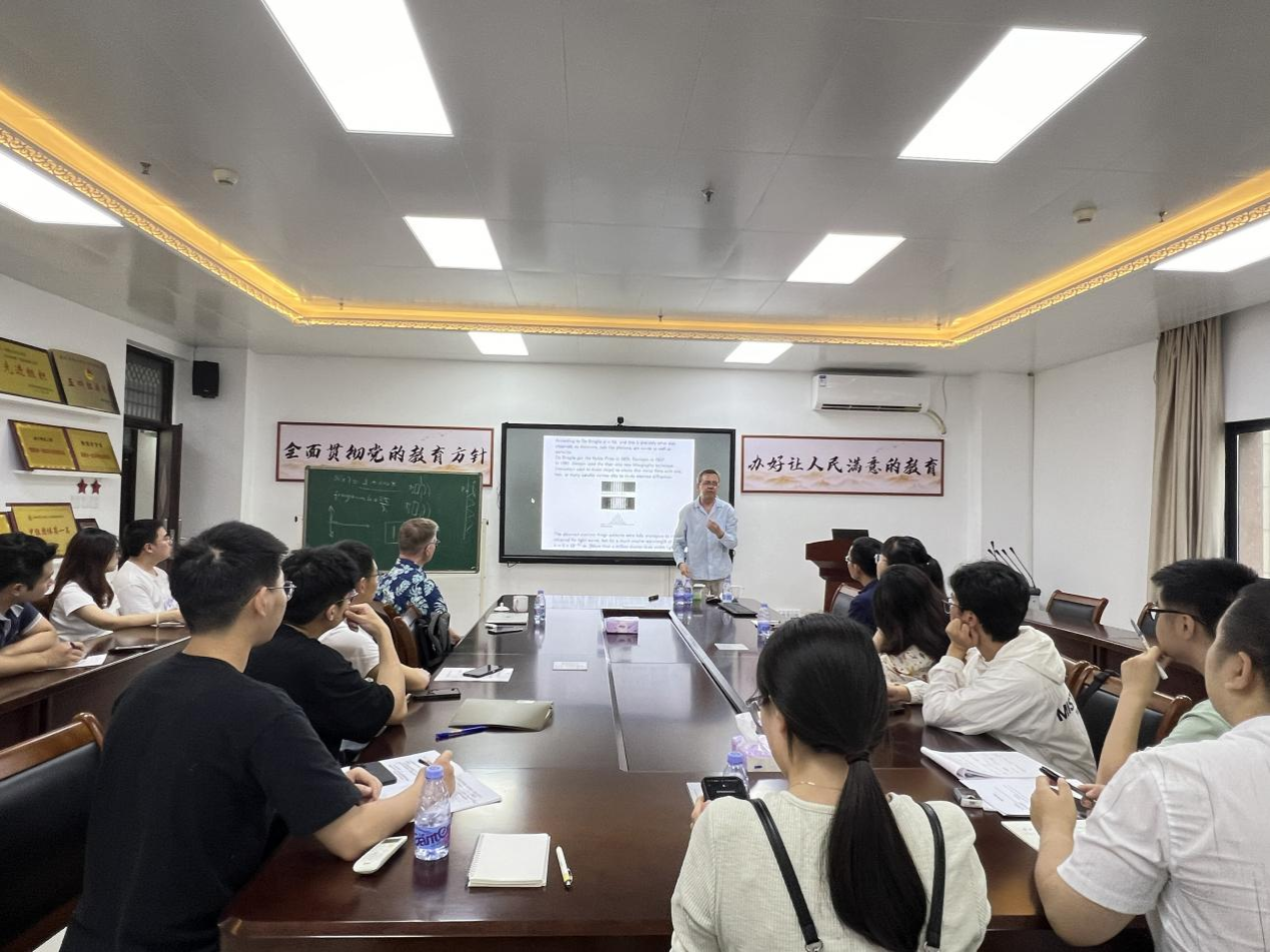 会议上半场,Taco教授通过介绍杨氏双缝实验的新奇特性,生动地展示了光子的波粒二象性,进一步分析了光在涉及表面等离子体偏振时的传输特性,揭示了光与表面等离子体偏振之间的相互作用,最后,教授通过生动的案例和深入的分析,展示了光在传输过程中可能经历的非经典路径,这一内容的介绍启发了现场师生的思考。