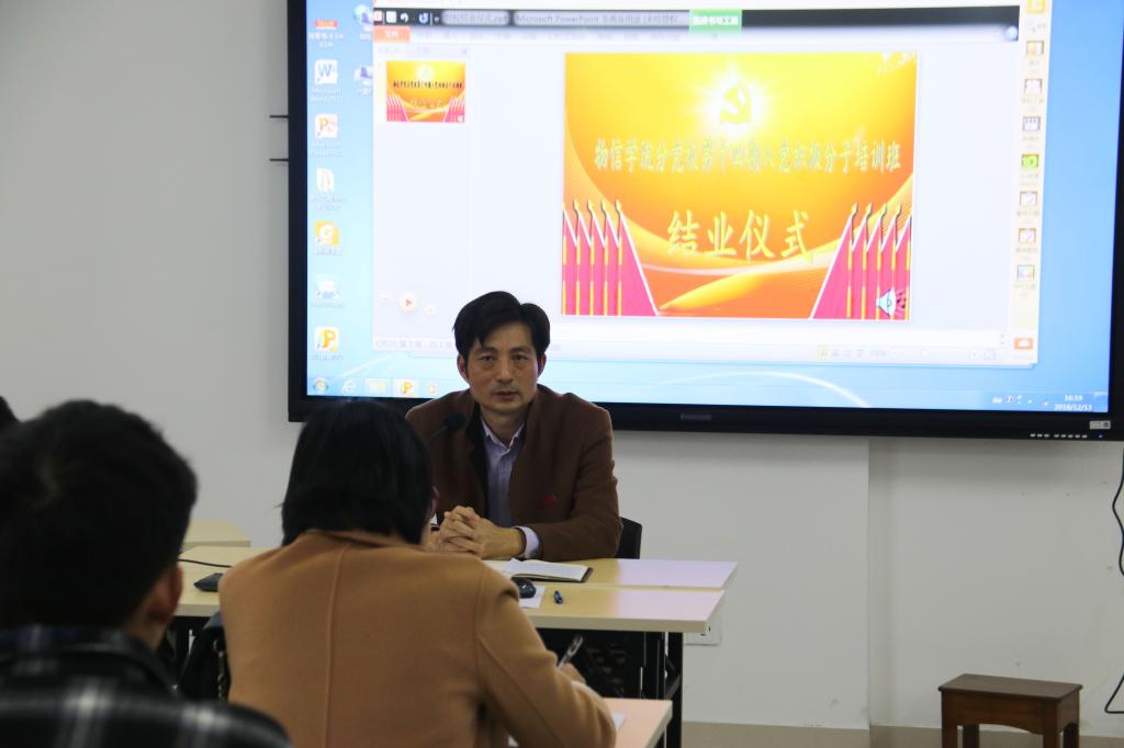 为帮助入党积极分子深刻领会十九大精神及习近平新时代中国特色社会主义思想,认真学习十九大新党章,理解掌握党的基本知识,物信学院分党校第十四期入党积极分子培训班于11月1日开班,经过一个多月的党校培训,学员们圆满地完成了各项学习任务。12月13日,党校结业仪式在科技楼南809室举行,结业仪式由院党委组织员李常老师主持。院党委主持工作副书记、分党校校长杨红和老师,院团委副书记杨超男老师,辅导员李主泉、黎淑晶老师出席了了本次结业仪式。