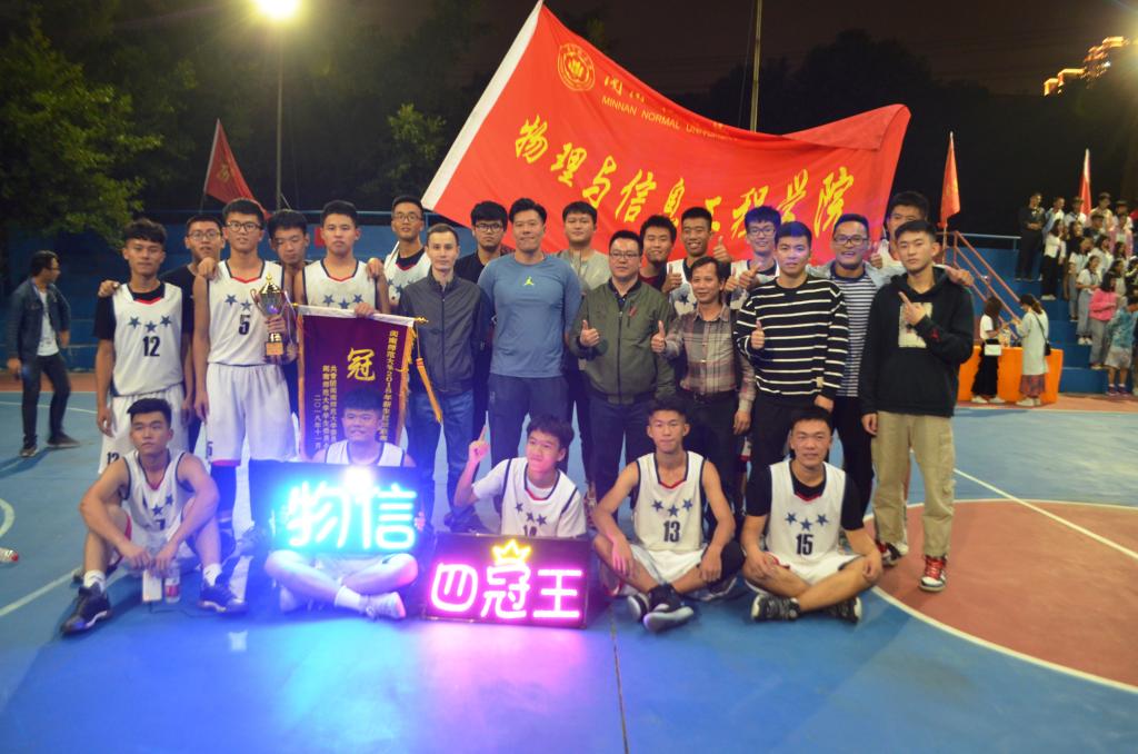 中场时双方啦啦队的精彩表演将观众的热情提至最高点,也给此次比赛增添了别样的色彩。啦啦队表演带来的热烈气氛还未消退,下半场比赛便开始了,双方互有攻守,又丝毫不懈怠,在物信队员持续发力之下,分差拉大至二十分;时间一分一秒的过去,球员们在这个没有刀剑的战场竭尽全力,每一个挑战地心引力的跳跃,每一次奋不顾身的扑救,每一道似弦如剑的身影,英姿飒爽、酣畅淋漓;随着终场的哨响,比分锁定在66:37,物信以巨大优势摘得冠军头衔,加冕“四冠王”!物信学院11号球员陈嘉伟荣获MVP荣誉称号。
