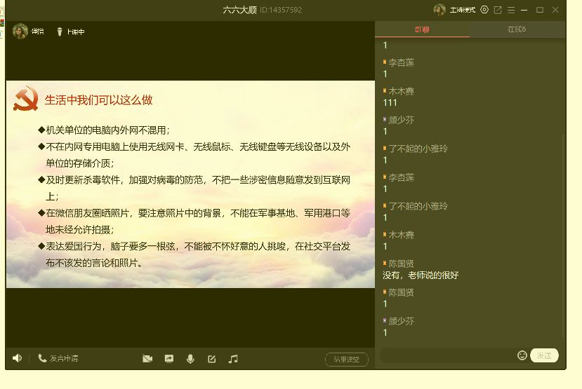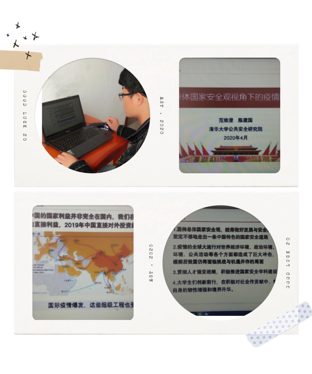 4.各学生党支部,教工党支部通过“三会一课”组织支部党员开展线上专题学习,学习习近平总书记总体国家安全观,学习《国家安全法》《网络安全法》《反间谍法》《反恐怖主义法》等相关条文,加深师生自觉维护国家安全意识和责任感、使命感。