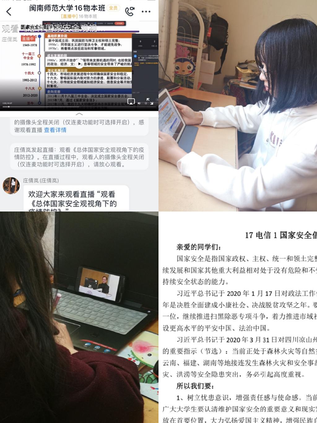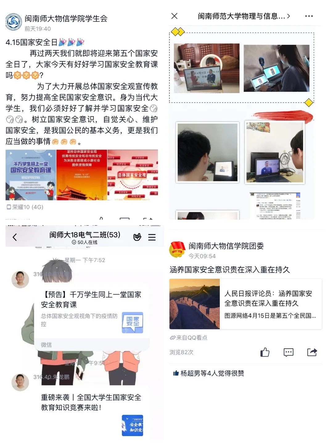 3.结合疫情实际, 充分利用云会议,QQ视频会议,微信视频会议等方式,认真组织师生学习国家安全法相关条文及习近平总书记有关国家安全的重要讲话等;积极组织各班级团支部开展国家安全教育知识竞赛、观看全民国家安全教育日新闻宣传报道、主题节目和国家安全主题公益广告、动漫视频、微电影等宣传影片。